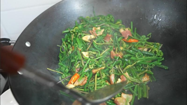 水蕨菜的烹制极为朴素,却极讲究火候。清新采回的水蕨,入开水焯烫两三分钟,马上捞出浸入冷水,既可去其微苦,又能锁住那口脆嫩。沥干后,锅中下猪油,与腊肉、蒜末同炒,腊香浸润,蕨香清新,二者井水不犯河水,进口精辟,余味悠长。