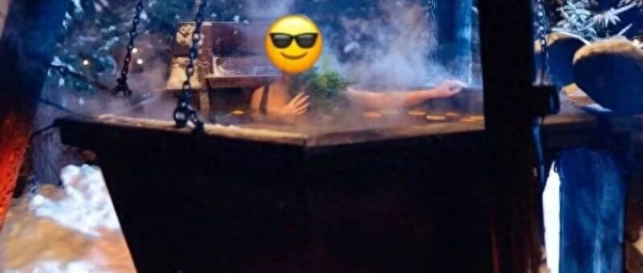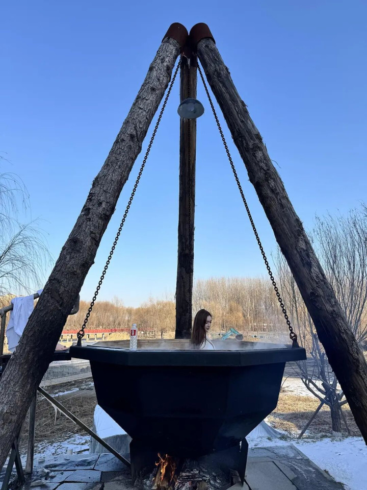 洋气的狂风雨和热带雨林杀青了与海外接轨,而原土性情款亦然真接地气。比如,某网红洗沐中心的室外泡池区把“铁锅炖我方”都给整上了,高大的泡缸下是真实毁掉的柴火。冰天雪地的户外,躺在冒着热气儿的铁锅里,抚玩着日落,场景很是空洞。
